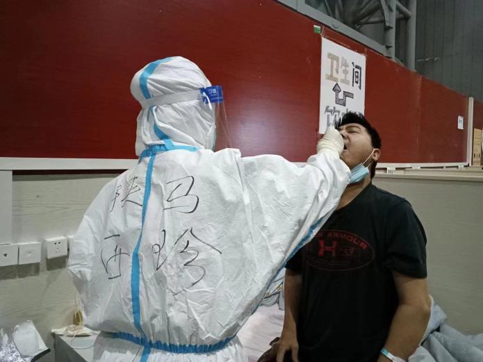高效,我们通力合作。由于时间紧,任务重,4月16我们医疗队在控感科吴燕老师及李遥护士长的部署下便开始了紧张有序的培训。为了保证每一位队员安全,必须经过严格的考核,合格后才可上岗。4月17日我们接管的清零方仓医院开始收治病人,我也开始投入到工作中。第一次进舱,心中还是有些紧张与不安,组长杨丹凤便看出了我的不安,耐心与我沟通,解除了我的顾虑。我们相互协作,从接诊到处理医嘱,书写病例、测血压、血糖等工作有条不紊进行着,并在控感老师的指导下规范脱下防护用品,顺利出舱。
