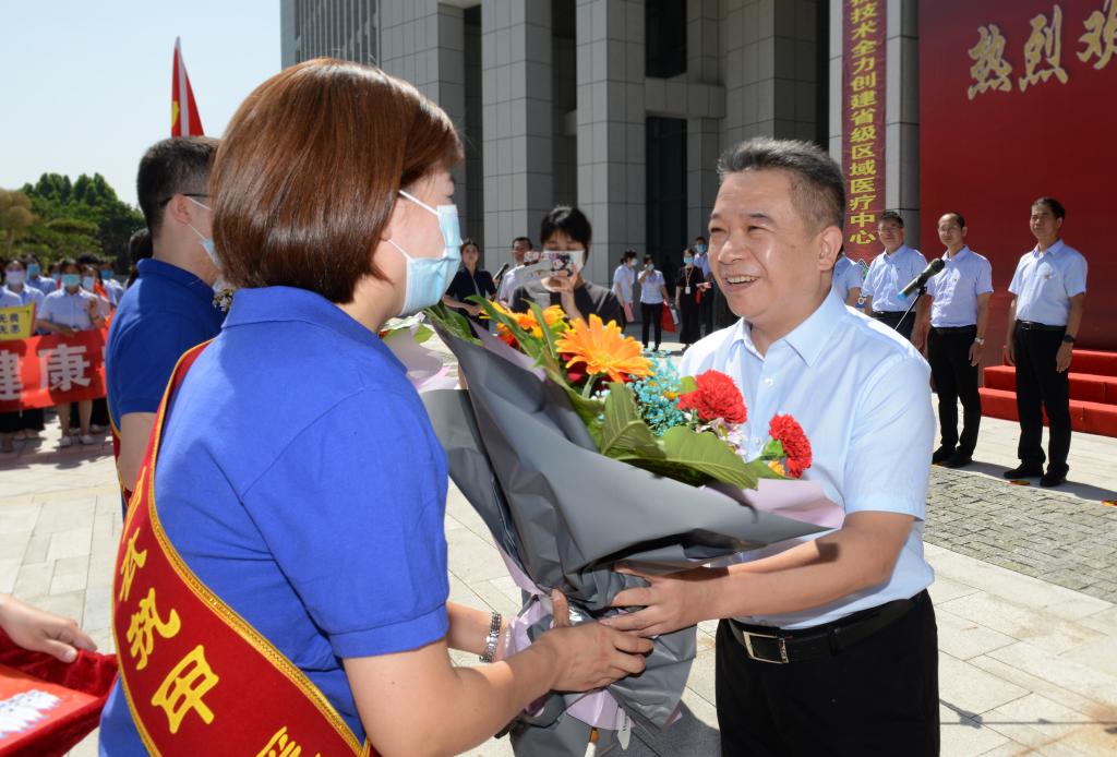 市卫健委党组书记、市中心医院党委书记张荣岗充分肯定了援护医疗队的工作,并代表市卫健委及全市卫健系统4万余名干部职工,向一直奋战在抗疫战线的全体医护人员,致以最崇高的敬意和最诚挚的问候。他指出,全体队员以精湛的技术、科学的护理,与时间赛跑、与病魔较量,实现了打胜仗、零感染的防控目标,出色完成了各项援助任务。同时,号召全市广大医务工作者要以援沪队员为榜样,积极学习他们的先进事迹,在工作中提升自我,锤炼品格,为全市卫生健康事业作出新的更大贡献。
