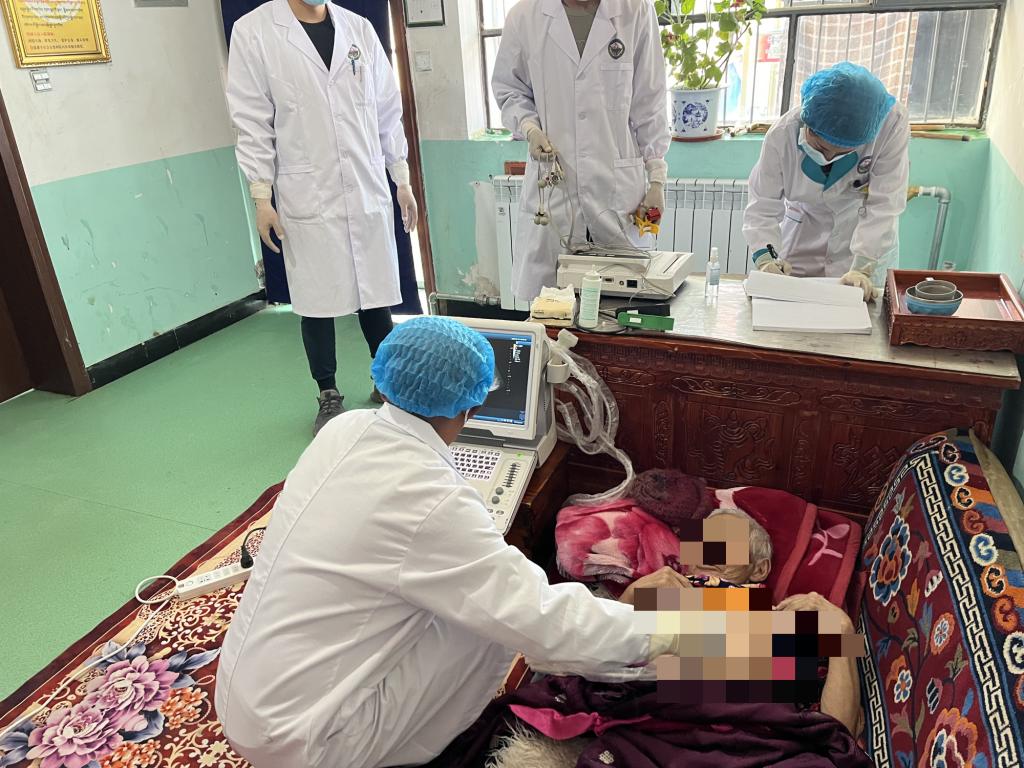 养老院内,医务人员为老人们测量血压、血糖,检查血常规、血生化、腹部B超、心电图等,并做相关检查。对于久病卧床、生活不能自理的老人,队员们专门为他们提供床头服务,细致检查。检查过程中,队员们详细解答老人们咨询的各类健康问题,为老人们讲解饮食、锻炼方面的保健知识。检查结果出来后,医疗队为部分长期服药老人完善治疗方案,提供方法帮助老人舒缓不适。