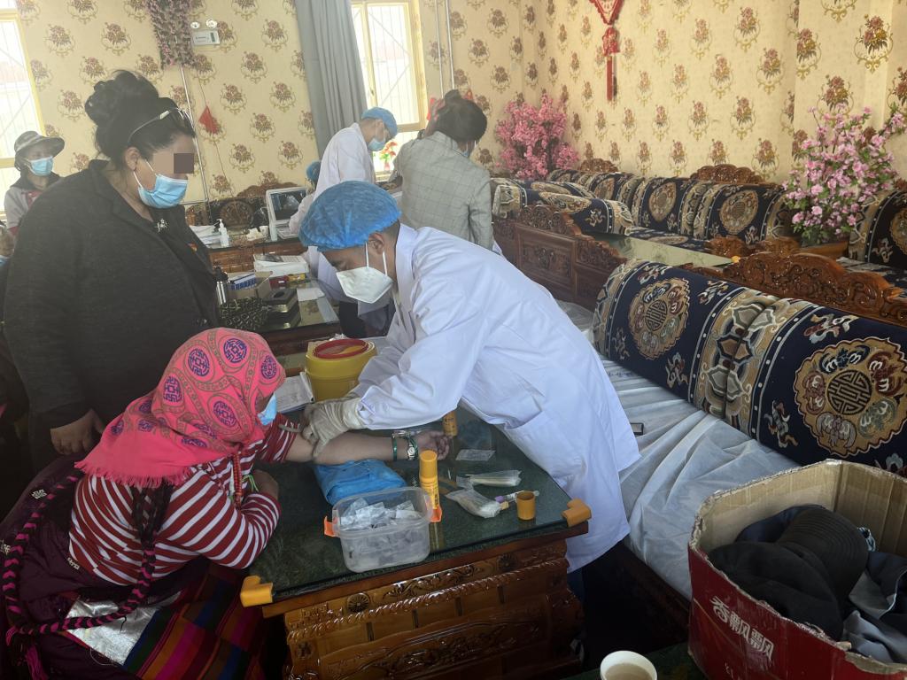 6月15日,渭南市援藏医疗队与革吉县人民医院医务人员一起,走进西藏阿里地区革吉县养老院开展健康体检活动,帮助老人进行自我调养和保健。