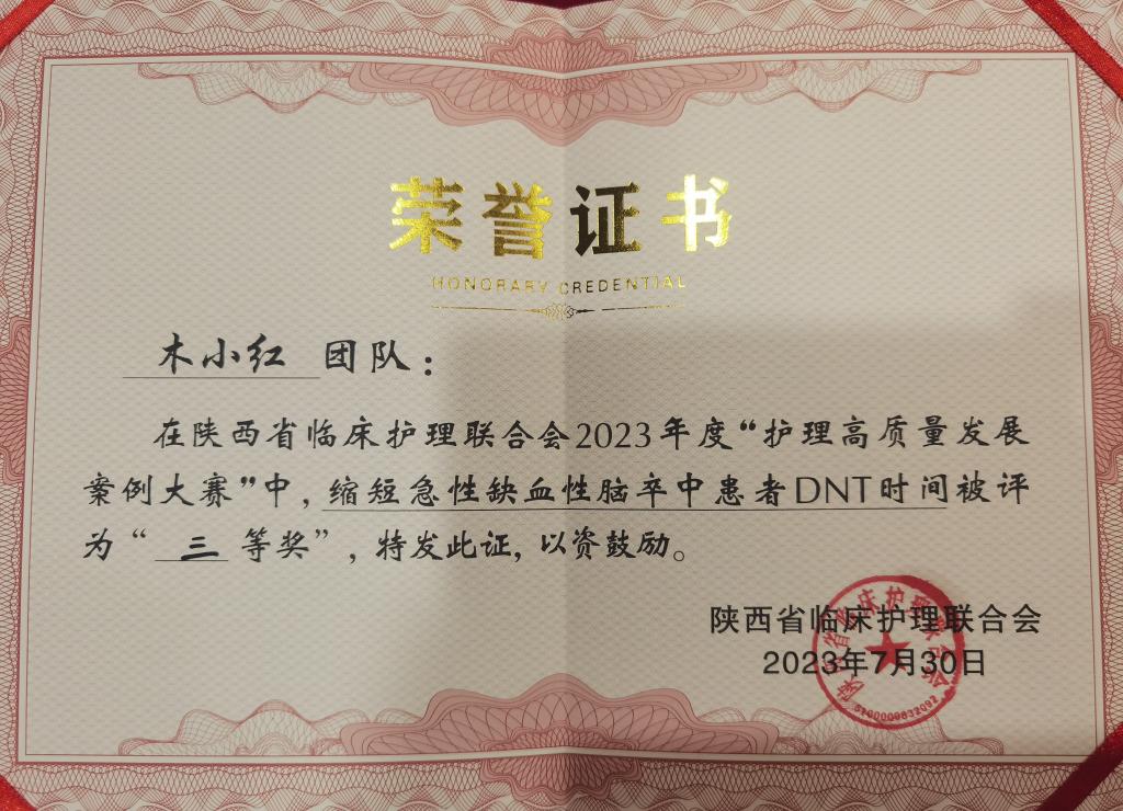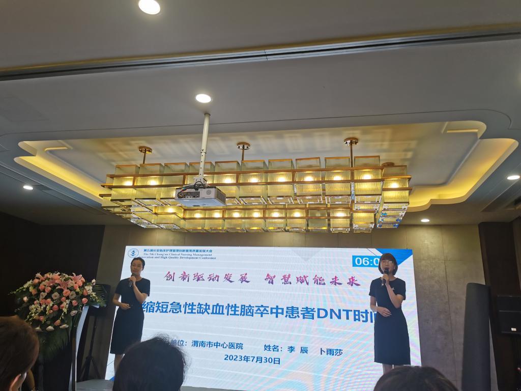 7月30日,急诊医学科护士李辰、卜雨莎参加陕西省护理联合会第五届长安临床护理管理创新暨高质量发展大会——“护理高质量发展优秀案例大赛”。全省共141个案例参加,经竞赛专家组筛选,评选出15例精品案例现场展示竞赛。市中心医院急诊医学科护理团队申报的《缩短急性缺血性脑卒中患者DNT时间》项目入选,经过激烈角逐,荣获大赛三等奖。