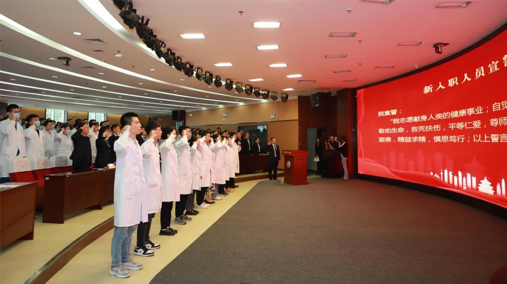 开班仪式上,院领导为新职工代表佩戴院徽。200余名新入职员工庄严宣誓,字字铿锵有力,作出“志愿献身人类的健康事业”郑重承诺。
