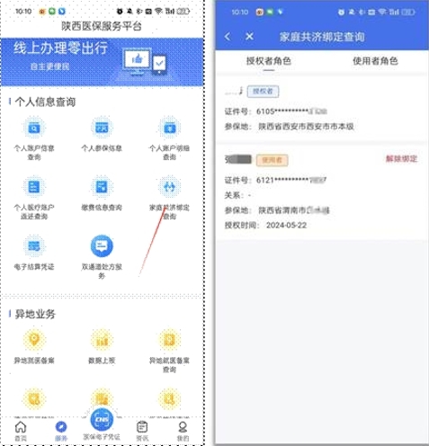 在“服务”菜单界面,点击进入“家庭共济绑定查询”页面,可以查询授权者和使用者的角色信息。