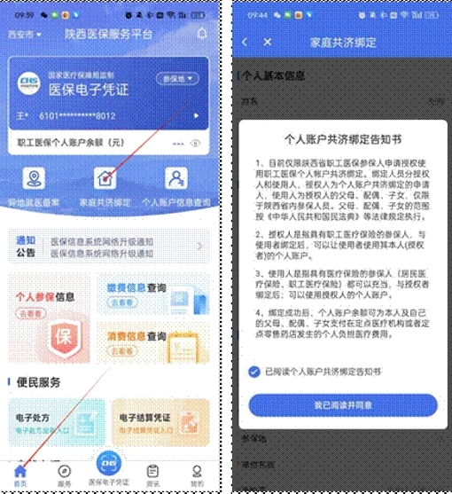 进入陕西医保APP后,在乐鱼(中国)-乐鱼菜单中,选择“家庭共济绑定”,进入页面后仔细阅读告知书内容,阅读完成后勾选“已阅读个人账户共济绑定告知书”,点击“我已阅读并同意”按钮,进入家庭共济信息填写页面。