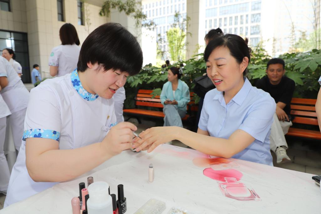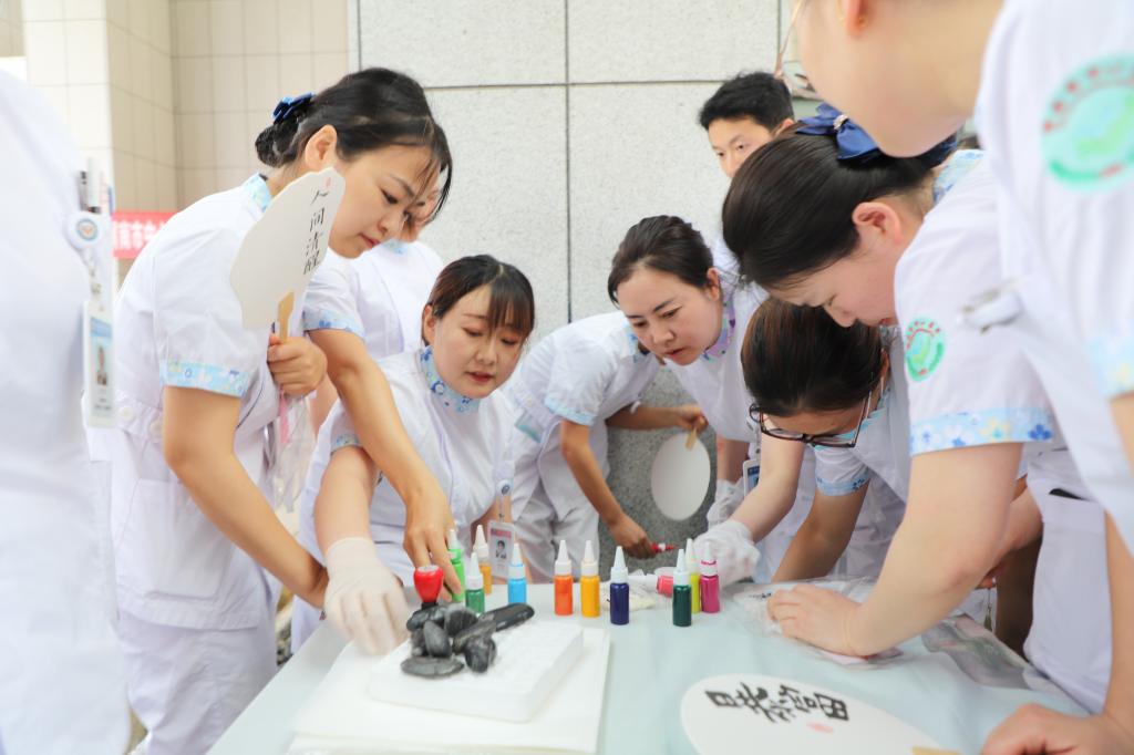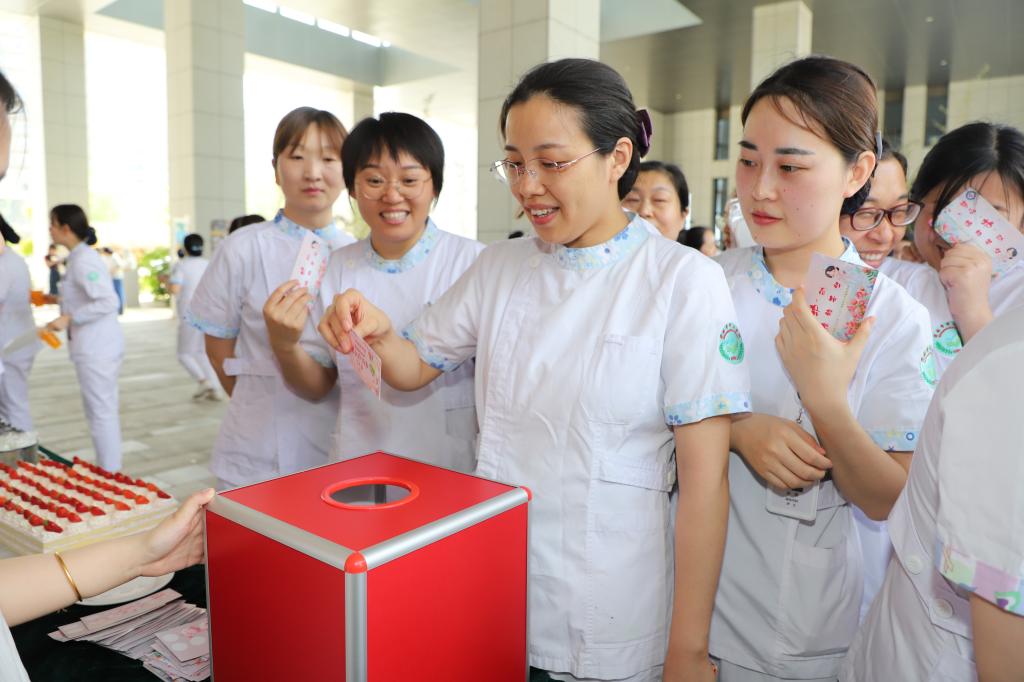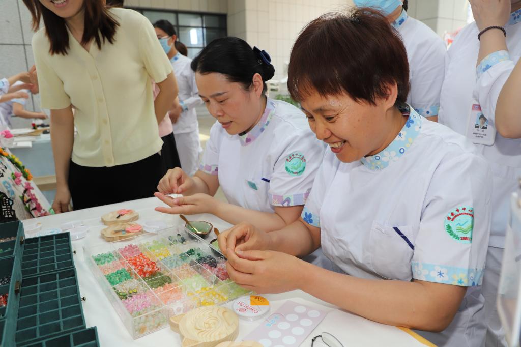 活动现场气氛热烈,健康运动区的袋鼠跳、趣味呼啦圈等项目展现了护理人的活力与朝气,趣味游戏区的"你来比划我来猜"和"开心套圈"等游戏引发阵阵欢笑。文化体验区的非遗漆扇、手工串珠等DIY项目让护理人员感受传统文化魅力,精心准备的美食则为参与者补充能量。幸运抽奖环节,大家积极参与,期待着自己能够成为幸运儿,赢取精美礼品。活动现场还设置了打卡场景,吸引了众多护理人员拍照留念,记录下这美好的时刻。