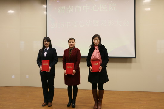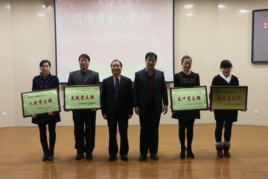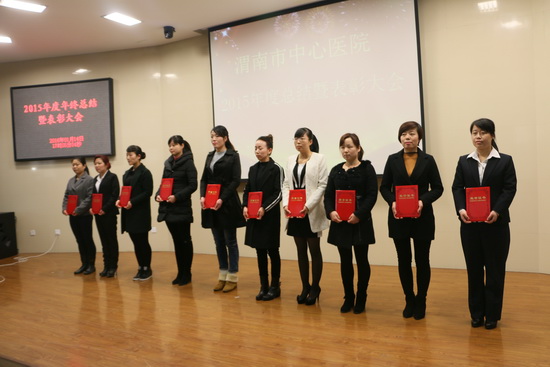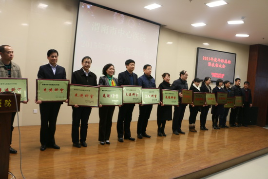 大会对2015年在各个岗位踏实肯干、默默付出的先进科室及优秀个人进行了表彰,颁发了奖牌和荣誉证书。心血管内科等3个护理单元荣获2015年度最佳护理团队;解明侠等3名护士长荣获2015年度优秀护士长;神经内科李娜等10人获得2015年度“十佳”责任护士;《经内镜逆行胰胆管造影术》等4项新技术获得2015年度新技术、新项目奖;神经内科刘燕的《中医药治疗帕金森病疗效机制的实验研究》、麻醉手术科苗良生的《一种新型吸氧面罩》获得2015年度科研成果奖;心内科李军农主任的《H型高血压患者个体化治疗在脑卒中中预防中的临床研究》获2015年度科研立项奖;心血管内科组织的《渭南市第三届心血管病论坛》荣获2015年度优秀学术会议奖;姜永红等2名医师荣获2015年度对口支援先进个人。大会并对神经内科等13个先进科室、行政党支部等4个党支部进行了表彰。