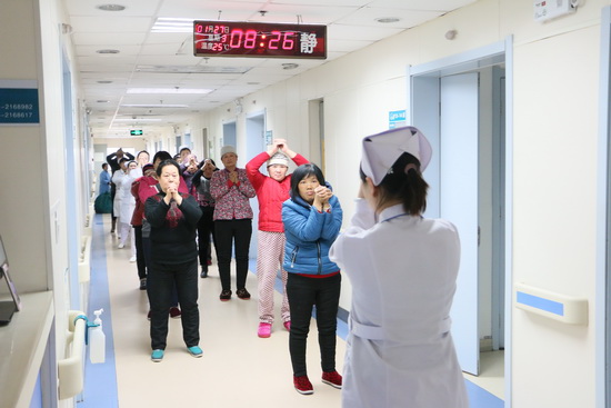 “乳腺术后有氧运动康复操”是将全身运动与局部肢体相互结合的运动。每天早晨8点,在音乐旋律的配合下,由专科护士现场集中指导训练,这样能够提高患者坚持康复治疗的主动性和顺从性,使患肢关节活动度和肌力达到最佳恢复状态,从而缩短患肢恢复时间,提高病人生活质量。