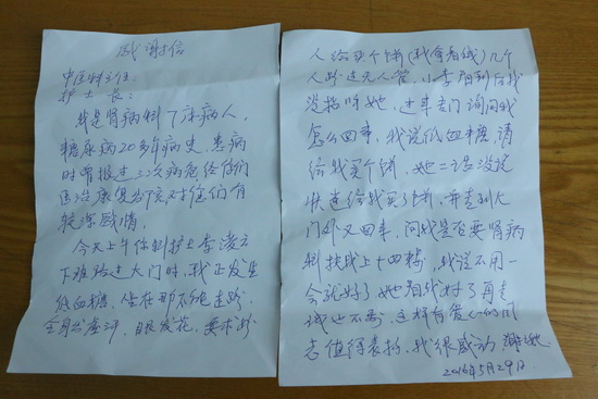5月29日,在我院肾病内分泌科住院的他早起下楼散步,走到门诊大楼前的时候,突然感觉心慌,恶心,全身无力,于是在石墩上坐下来拿出10元钱求助路人帮他买个饼,来来往往过去了十几个人都没有停下脚步帮助他。等他已经晕的快坐不住的时候,一个年轻女子过来主动询问他怎么了,还帮助他买了早饭等他吃完,身体状况恢复正常后才离去。他后来打听得知女子是我院中医科的一名护士,于是便前来感谢。