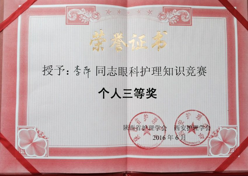 为夯实基础护理、提高眼科护士专科理论水平,激发护理人员学习的热情,6月3日由陕西省护理学会、西安护理学会眼科专业委员会主办的护理知识竞赛活动在西安举行。我院眼科响应号召、积极参与,在自愿报名的基础上选派李萍、关小琳、王熙倩三名骨干护士参加了本次竞赛。经过笔试、抢答等环节,李萍获得个人三等奖,关小琳、王熙倩获得个人优秀奖。