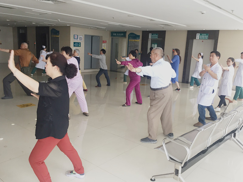 每日清晨准时八点,科室的患者及医护人员都会不约而同地聚集到住院部十四楼电梯口,由主管护师许婷婷带领大家练习“八段锦健身操”,这已经成为他们共同的习惯。由于中医科患者大多数属于老龄化患者,每日练习前由一名责任护士带领锻炼,两名责任护士和一名大夫在周围负责保护患者的安全,每次10分钟。由在场的医护人员收集每天锻炼结果,锻炼者的自身感受,以及每个动作掌握的难易程度,对收集的结果进行分析。并结合患者实际,对体操动作、锻炼时间, 参加的人员做出适当的调整,制定出更加适合患者锻炼的“八段锦体操”,使其能惠及更多的患者和家属。
