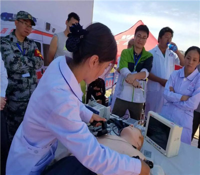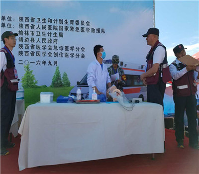 本次拉练在榆林市靖边县四柏树村举行,模拟灾区水电供应中断,基本生活无法保障的情况下开展医疗应急救援。救援队于9月1日早晨6:30分出发驱车7个小时按时到达榆林市靖边县四柏树村集结地。21名队员相互协作,熟练地完成搭建帐篷、调试发电机等事项,并在下午5:00点前搭好营地,晚上就地宿营。拉练地点条件艰苦,风沙大,水资源匮乏,仅仅能够保证生活用水。9月2日上午集结仪式结束后,来自全省十余个地市的应急医疗队进行了医疗救援竞赛,我院在野外拉练竞赛环节分别参加了气管插管、包扎转运、心电除颤、心肺复苏等四个项目,经过三个小时的激烈角逐和精彩的竞赛展示,获得观摩领导们和各兄弟代表队们的一致好评。3日下午,我院救援队安全返回渭南。