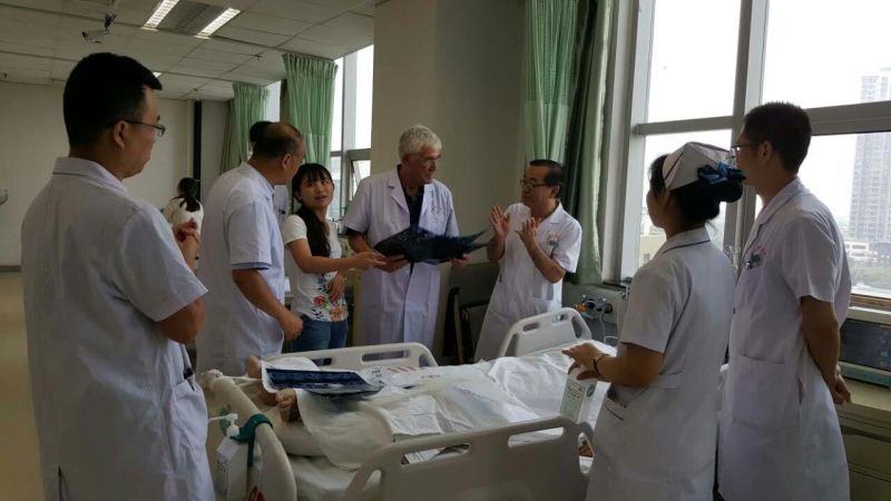 随后,彼得教授来到神经外科医生办公室。他不仅是一家医院的院长,更是一名神经外科的教授,他掌握了该领域广泛的先进理论知识,并且具有丰富的临床诊断和手术经验,所以他很期待同我们的神经外科医生进行交流。在经过短暂的自我介绍后,彼得教授跟神经外科的医生们对几个典型病例和疑难病例进行分析讨论。之后彼得教授针对儿童颅骨修复、胶质瘤术后水肿的用药、开颅大骨瓣减压手术等,都给予了可行有效的治疗方法及指导意见。在这两天时间里,彼得教授不仅走进病房进行大查房,对患者的病情详细询问并给予治疗意见。还跟神经外科的医生们一起进手术室,进行术前指导,并把先进的治疗理念分享给我们的年轻医生们。