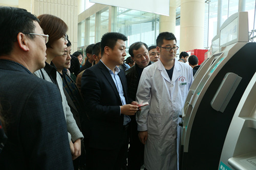会后,各医院信息建设工作骨干人员到门诊大厅,现场观摩了我院用卡环境改造成果,并用测试卡亲自示范健康卡的用卡流程。