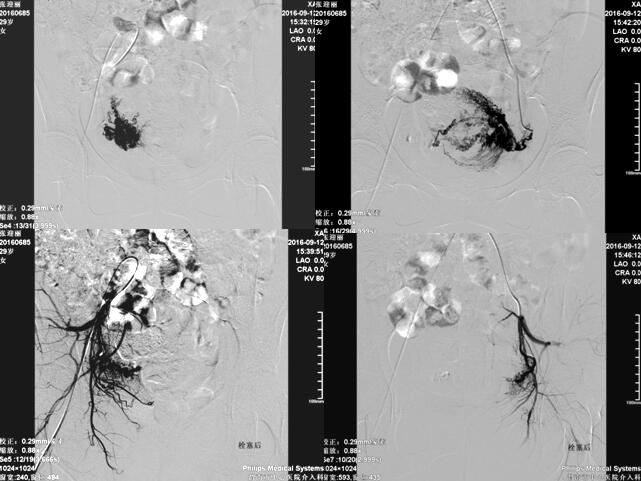 经子宫动脉栓塞术还可应用于子宫腺肌症、胎盘植入、瘢痕妊娠、前置胎盘及产后大出血等疾病,以下为一例产后大出血患者介入治疗图片: