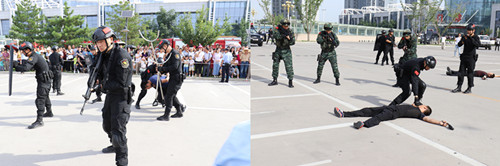“门诊大楼有人拿刀砍人,请大家赶快撤离。”医院巡逻队员大声喊道。只见就诊患者慌乱的从急诊大厅跑出来。东广场也有持凶的歹徒在乱砍无辜群众,恐怖事件正在进行中……病人和家属及医护人员四处逃离,1号歹徒将一名抱孩子的产妇踢倒,乘轮椅的患者被推倒,歹徒追赶其家属。现场一片混乱,公安防暴队立即赶往现场控制歹徒,120急救中心及相关科室医护人员迅速开展急救,8时45分,由三架直升机组成的航空救援参演分队成为本次演练的一大亮点。在120急救中心对伤者进行急救时,两名伤者因伤势严重被前往救援的直升飞机送走急救,演练结束。