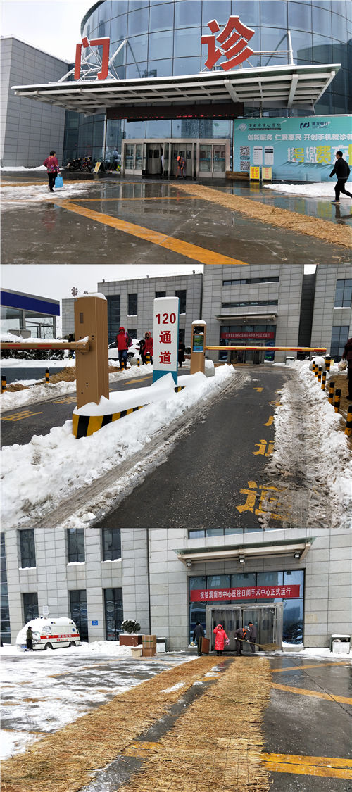 寒风中,同志们齐心协力、相互配合,你铲我扫,干的不亦乐乎。一点点地将厚厚的积雪和冰层铲起集中堆放,并不断在路面撒上粗盐加速冰雪的融化。尽管大家的手和脸都冻得通红,但手中的扫雪工具却不停地挥舞着,忙得浑身是汗。在大家的共同努力下,终于扫出了干净的路面和畅通的大道,为防止有人滑倒摔伤,大家还在斜坡路面铺上了稻草,及时为患者及家属开辟了一条“绿色通道”,方便患者就医,同时维护了医院正常的医疗秩序。