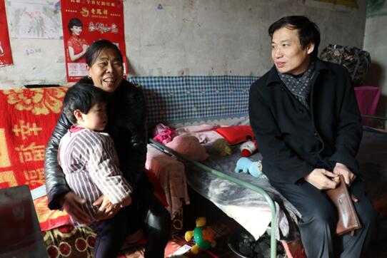 院领导走村入户自查健康扶贫工作落实情况,在贫困户家里与他们交谈。