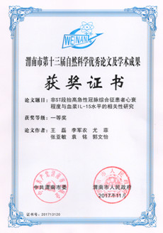 2017年12月28日下午,渭南市科协三届三次全委会议召开,大会对第十三届自然科学优秀论文及学术成果进行了表彰。我院心内科主治医师王磊的论文《非ST段抬高急性冠脉综合征患者心衰程度与血浆IL—15水平的相关性研究》荣获渭南市第十三届自然科学优秀论文及学术成果一等奖。
