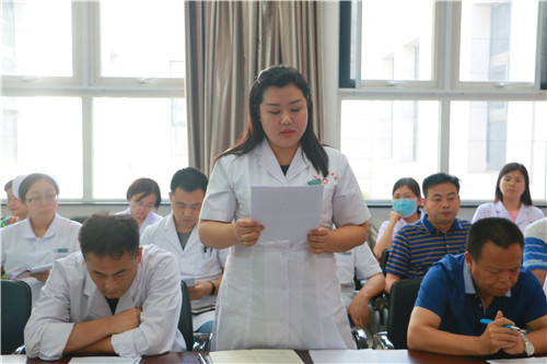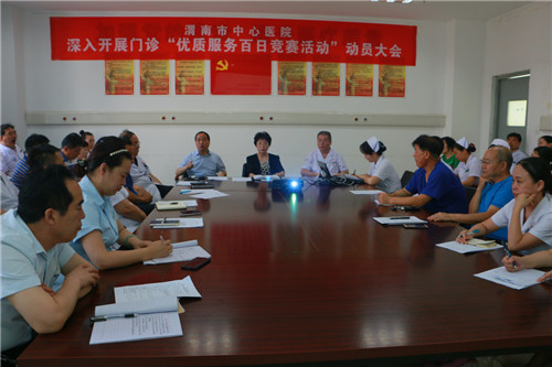 为进一步贯彻落实国家卫健委“进一步改善医疗服务行动计划(2018-2020)”文件精神,结合医院中心工作,努力营造和谐健康、积极向上的门诊工作氛围,切实改善患者的就医体验,6月20日下午16:00,门诊部组织召开了门诊“优质服务百日竞赛活动”动员大会。院长张进社、副院长黄慧玲以及医技科室、窗口单位、门诊临床检查治疗室负责人40余人参加了会议。会议由主管副院长黄慧玲主持。