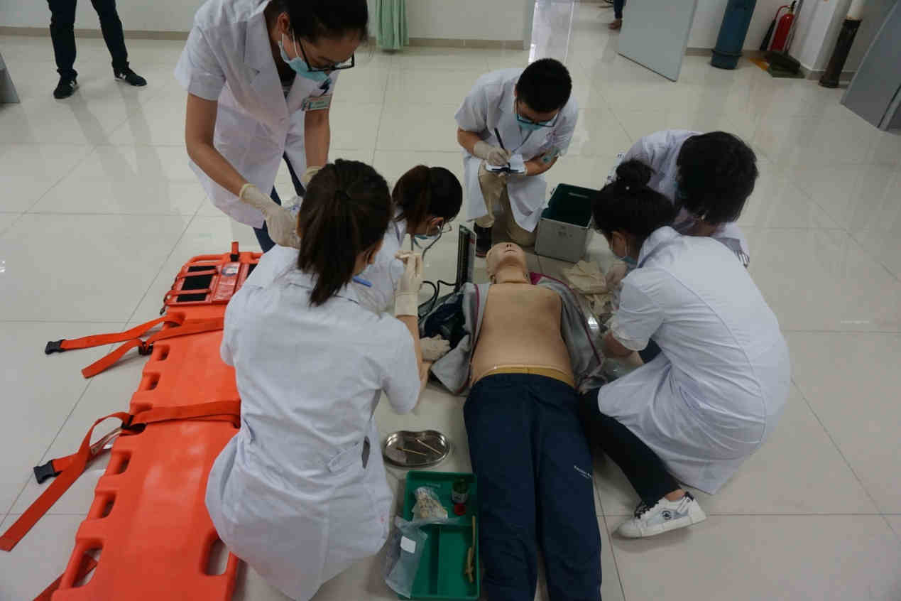演练项目分为三个场景,第一项为“股骨干骨折患者的现场救治和转运”,第二项为“事故现场心肺复苏和转运”,第三项为“腹部开放性外伤患者的现场救治和转运”。