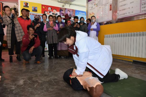 第三部分由丁艳主管护师主讲,题目为《实用急救知识培训》。丁艳结合实际例子,向在场藏族同胞强调了紧急救护“黄金四分钟”的重要性,详细讲解了心肺复苏的要点,创伤止血救护及意外伤害等应急救护的专业知识,并现场模拟演示了心肺复苏术急救操作,提高大家自救、互救能力,掌握如何在第一时间作为“第一反应者”为生命争取时间。