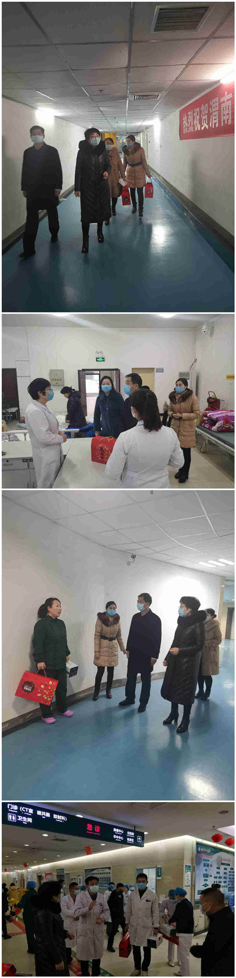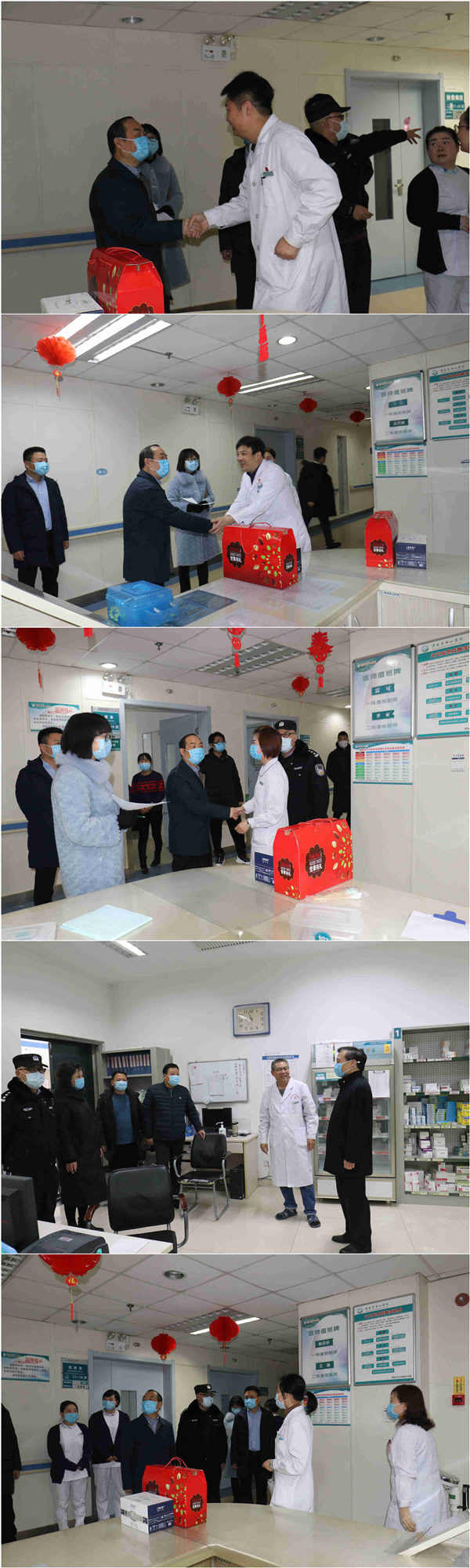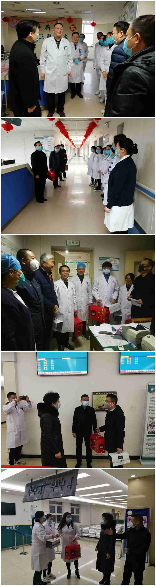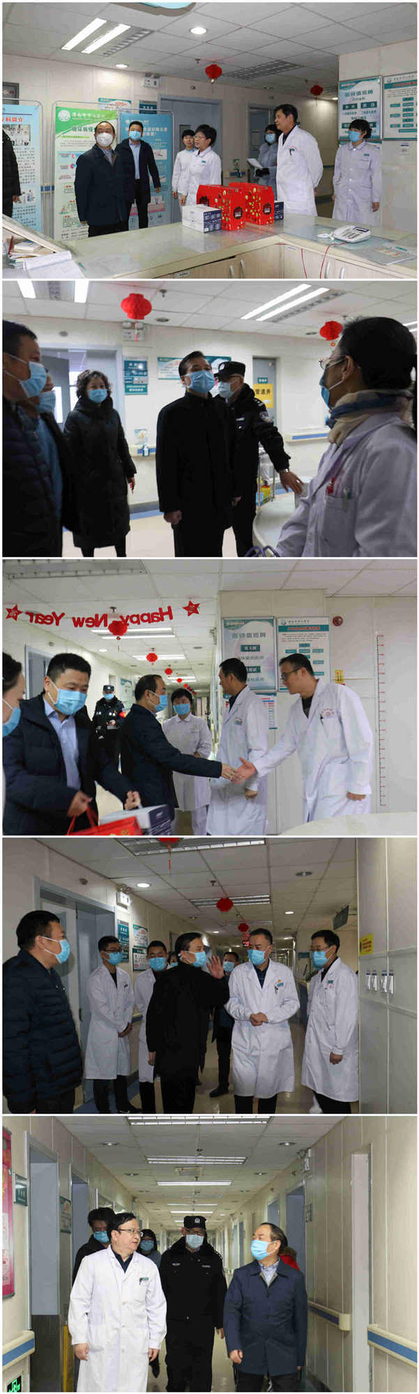 1月25日,农历大年初一早上八时,院长张进社、党委书记鲁海燕、副院长乔梵、副院长黄慧玲、副院长焦建雄、工会主席施泰来、纪检委书记张建实带领部分职能科室负责人,来到临床、医技、急诊科、各窗口部门及老院区进行春节慰问。