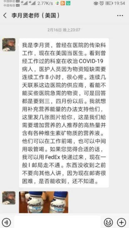 原来在2月中旬,远在大洋彼岸美国做医生的李月贤医师看到李红兵主任的朋友圈,得知科室在收治COVID-19患者,且医护人员因为物资短缺需要连续工作8小时,很是心疼。他想为家乡人民抗疫行动尽自己的一份力,遂联系美国的相关供应商,想给科室邮寄防护物资,得到的答复是要到三、四月份以后才能获得。李月贤医师心急如焚,立即自费购买补充能量的营养粉,并在自己所在的科室征集医用口罩等防护物资(目前美国流感流行形势也很严峻),通过联邦快递邮递到科室。目的是想让进入隔离病房的医护人员能在病房里有足够的能量支撑,并能得到最好的防护。因为海关的原因,最终快件在辗转多日后才送到李红兵主任手中。