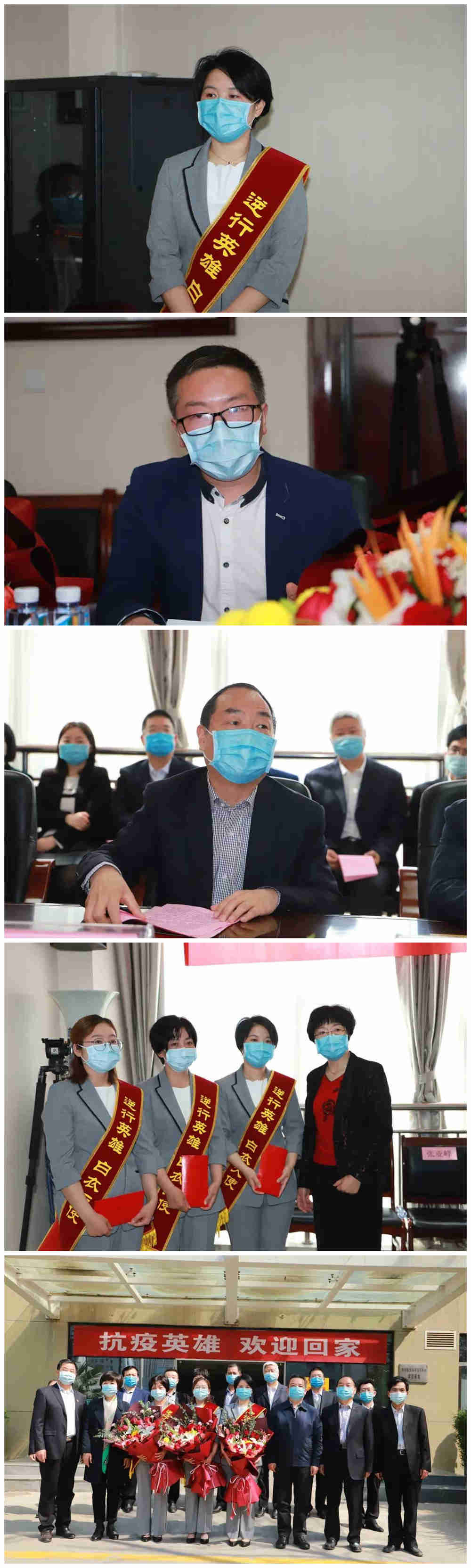 黄慧玲副院长为3位援鄂英雄发放慰问金,并与她们热情拥抱。欢迎仪式结束后,大家与援鄂英雄们合影留念。