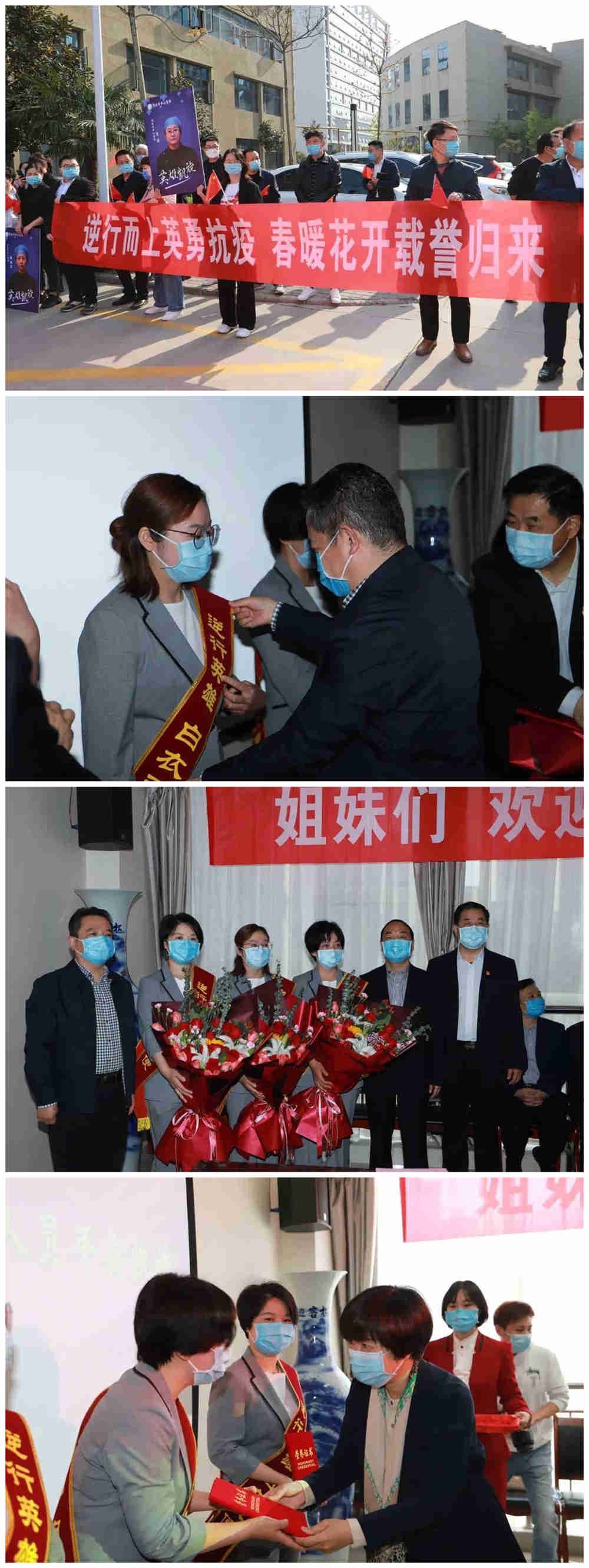 最美的鲜花送给最可爱的人,上午9时30分,医院领导、职工、医疗队员家属等,近百人戴着口罩,手持小国旗,齐聚医院行政楼下,等待着英雄们归来。