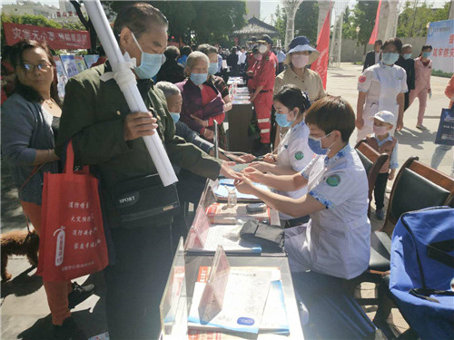 义诊现场,急诊科主治医师杨涛、王海龙及医护人员对市民进行外伤急救包扎、心肺复苏、海姆立克等急救操作演示及要点讲解,同时发放宣传资料,围观群众学习热情高涨,积极上前学习操作手法。现场糖尿病小组还对群众进行测量血糖、血压,并进行糖尿病知识及健康宣教。