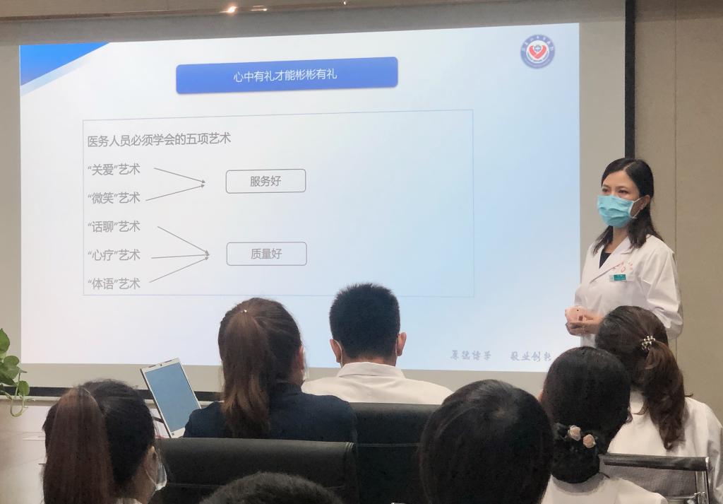培训现场,刘娜分别从谈吐举止、待人接物、沟通技巧、优雅形体以及医务人员必须掌握的“五项艺术”,即“关爱”艺术、“微笑”艺术、“话聊”艺术、“心疗”艺术、“体语”艺术五方面进行详细讲解。同时,为大家解读了“55387法则”,培训内容延伸到不同岗位的服务规范要求,采取现场示范的方式,提升全体医务人员礼仪修养,全面推进优质服务全过程。她强调,如果仅把医学作为一种知识和技能,医学就没有灵魂,要发自内心地真诚尊重生命尊严,让受检者感受到心灵的关爱与温暖,学会仁爱、学会尊重。