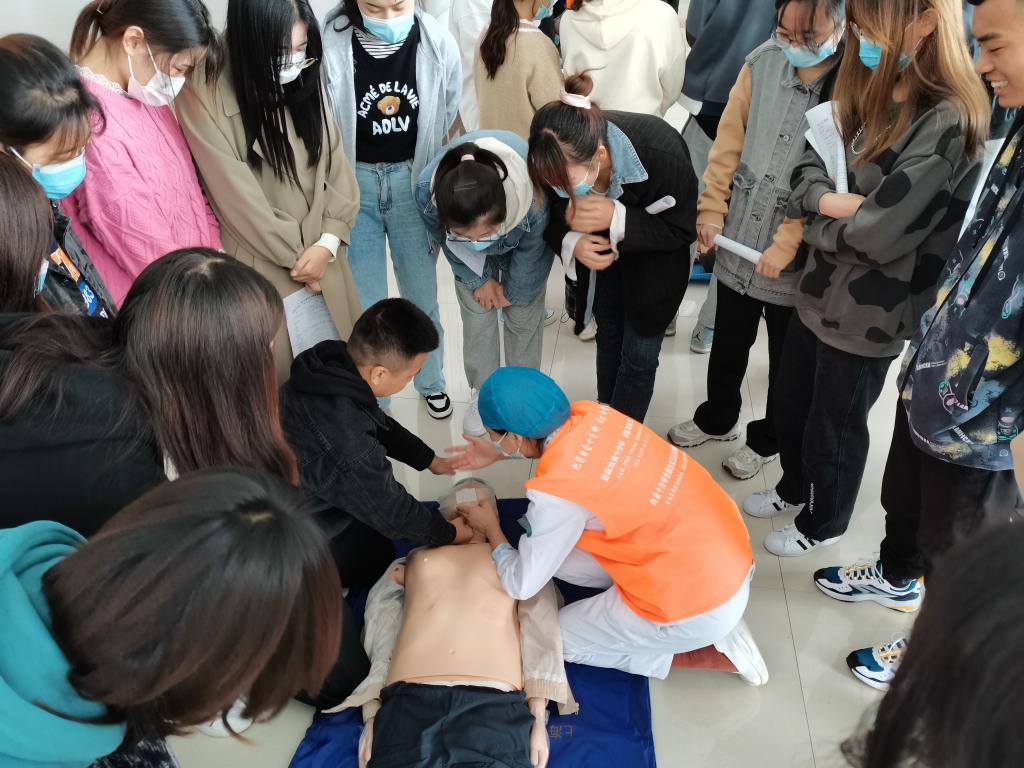 活动现场,市中心医院急诊科护理团队向志愿者们演示心肺复苏和海姆立克急救方法,现场教学,在场志愿者全员参与,动手进行实际操作。练习环节,急诊科护士长穆晓红分步骤边讲边做,为志愿者们进行考前指导。学习结束后,急诊科副主任王二宁带领队员们对志愿者进行心肺复苏考核,同时对考核中存在问题进行纠正。