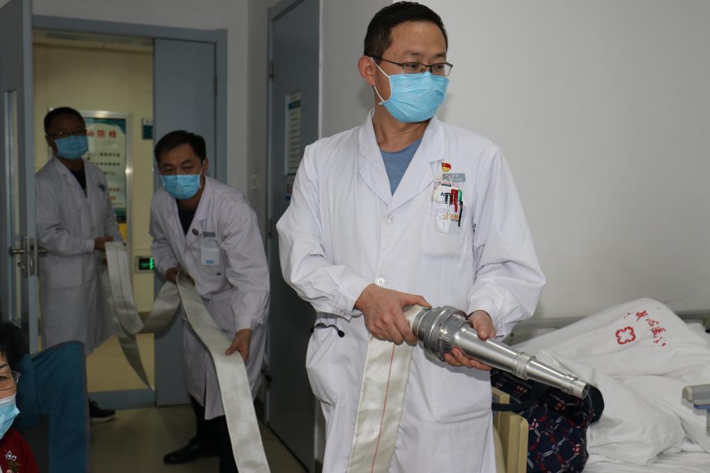 11月4日下午5时10分,在市中心医院,随着现场指挥、保卫科科长朱永强的倒计时指令,保卫科人员按照既定安排触发消防系统联动。