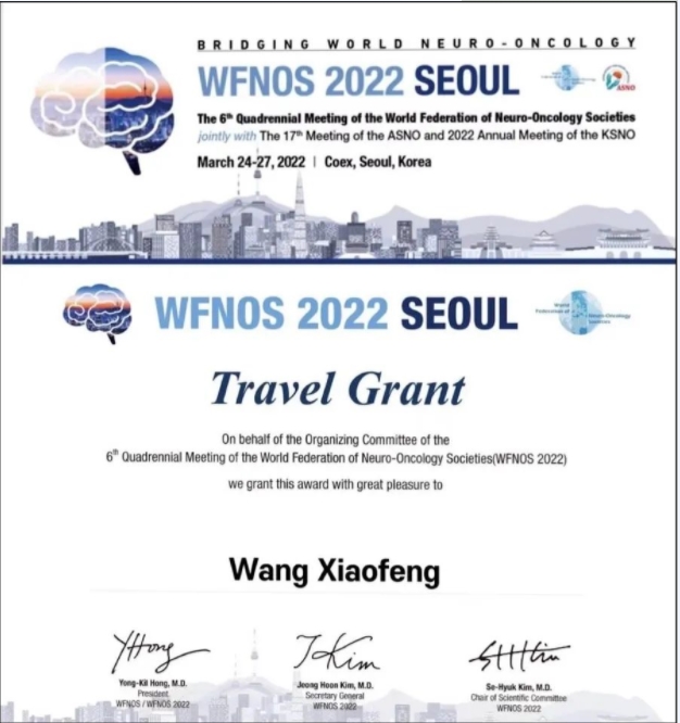 3月24日至27日,王小峰医师参与了世界神经肿瘤学会联合会(WFNOS)第六届学术年会。本次年会在韩国首尔举办,展示了渭南市神经外科新声音。他的《Effect of intraoperative B-ultrasound on the quality of life of patients with glioma in functional area after operation》,详细介绍了科室近年关于功能区胶质瘤的手术治疗及管理内容,获得良好声誉及项目资助。