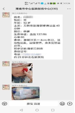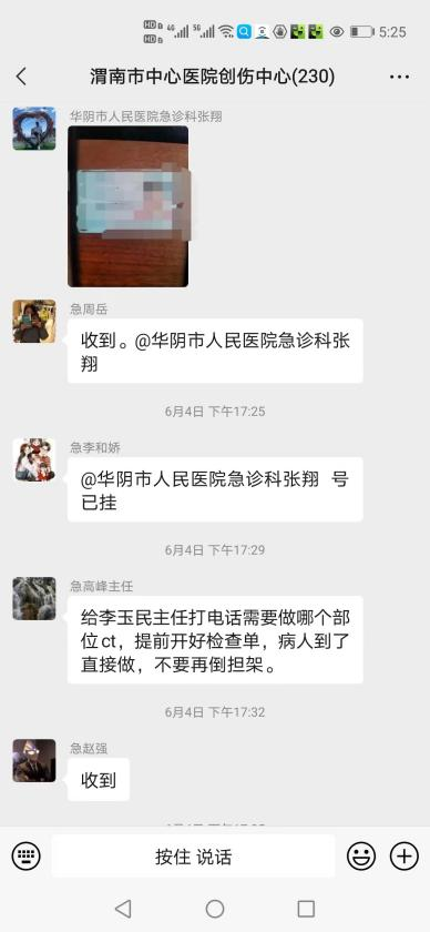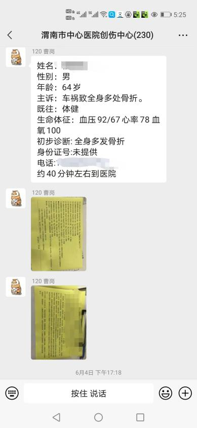 上下联动,跑出急诊“加速度”。6月4日下午,医联体医院接诊一名被车撞伤的老年男性患者,情况危急,当地医护人员立即给予抗休克,维持生命体征等处理,拨打“120”急救电话上转患者。 “120”快速出车,评估后转诊患者,途中跟车医生、当地首诊医生同时将伤者信息、门诊病历上传至市中心医院创伤救治中心微信群。市中心医院创伤中心值班人员接到信息后,分诊护士快速完成患者挂号、创伤中心值班医师提前开具血检、CT等相关检查单,抢救室护士做好抢救准备。同时,创伤中心主任“紫云系统一键启动”相关专科现场等候患者,实现“病人未到信息到”创伤救治理念。17时50分,患者顺利送入急诊科抢救室,采血配血,急诊医护及专科会诊医师陪同直达CT室完成专科检查,CT室内创伤中心、骨科、重症医学科完成会诊,检查结束送重症医学科收住入院,整个过程历时9分钟。目前患者病情稳定。