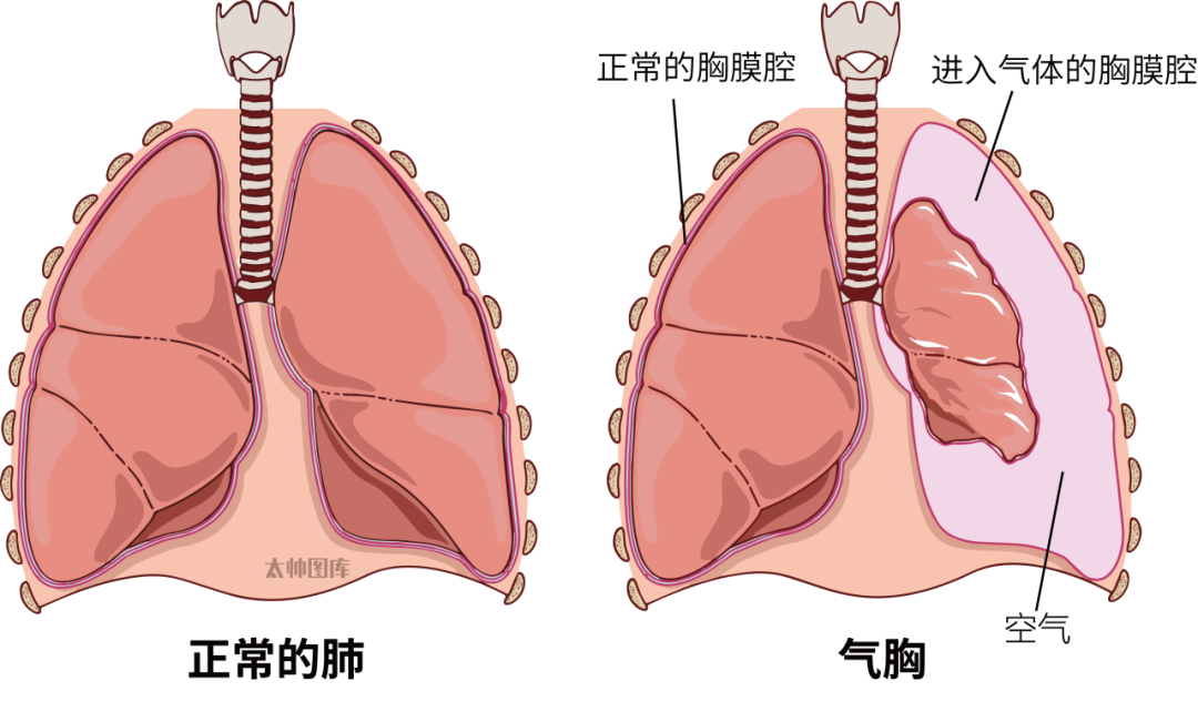 什么是气胸?气胸(Pneumothorax)是指气体异常进入胸膜腔(肺与胸壁之间的潜在腔隙),导致肺组织受压塌陷。正常情况下,胸膜腔为负压环境,维持肺部扩张。像气球被挤破后漏气,肺部一旦破损,气体进入后,压力失衡,肺萎缩影响呼吸功能,轻则胸闷憋气,严重时可引发休克甚至死亡。造成气胸的原因有多种,主要分为自发性气胸、外伤性气胸和医源性气胸。