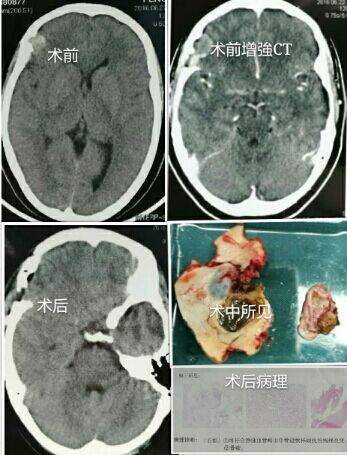 患者冯某,女,54岁,临渭区官底镇人,因“头痛、头晕”于 6月23日入住神经外科二病区。入院后行颅脑影像学检查提示:右侧额部占位病变,脑膜瘤,额骨骨瘤。入院后白西民主任医师高度重视,考虑不排除硬脑膜动静脉瘘可能,积极进行术前准备。6月29日,在杜春亮主治医师及赵云洁医师配合下在全麻下行右侧额部占位病变及额骨骨瘤切除术。术中发现占位病变与脑膜关系紧密,血供丰富。在大家的共同努力下,手术获得成功。病理检查提示:符合静脉血管畸形班管壁粥样硬化的病理改变;骨瘤。