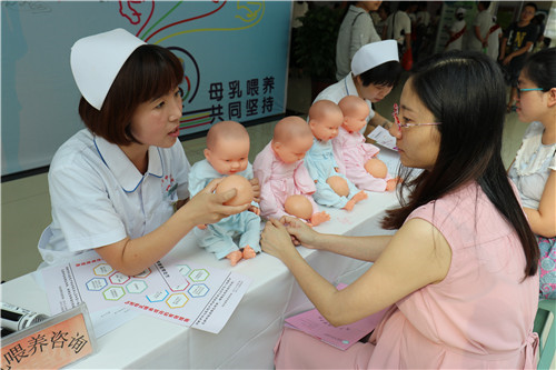 启动仪式之后,在产科门诊前进行母乳喂养的咨询活动。聂艳给准妈妈普及道:“母乳是婴儿最好的食品,营养全面,宝宝容易吸收,并且含有独特的抗体。母亲喂养孩子的同时,能够预防乳腺癌、卵巢癌等等疾病。”