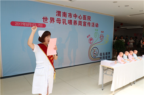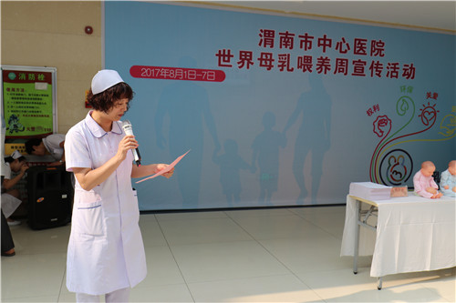 活动开始,医务科副科长刘韬宣布我院2017年世界母乳喂养宣传周活动正式启动。他强调,自2015年我院成功通过了国家爱婴医院的评审工作,被授牌“爱婴医院”以来,一直认真落实爱婴医院的十条标准,已在全院逐步形成了“母乳喂养好”的氛围。我们还会继续努力,把母乳喂养率逐步提升,将母乳喂养进行到底,给更多孩子最好的开始。