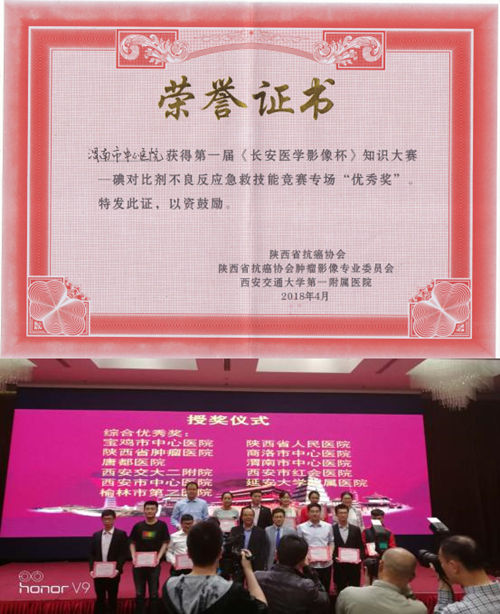 4月1日,市中心医院CT&MR影像诊断科张耀森主任带队,携队员焦磊、王金璇、田果及张娜参加了陕西省“第一届《长安医学影像杯》知识竞赛---碘对比剂不良反应急救技能竞赛专场。”本次竞赛由陕西省抗癌协会主办,陕西省抗癌协会肿瘤影像专业委员会、陕西省医学会放射学分会、西安交通大学第一附属医院承办。参赛队伍涵盖全省各地区一流的17家三甲医院,如西安交通大学第一、第二附属医院,空军军医大学西京、唐都医院等。