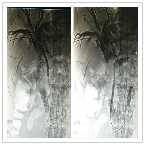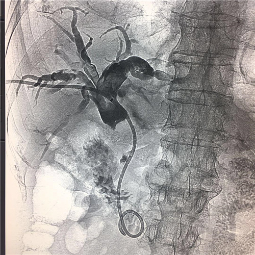 患者全身皮肤金黄瘙痒难忍,在B超定位下行肝内胆管引流术、术后因引流不畅拔管;在胃镜下逆行ERCP胆管支架植入术,经过术者反复操作,但导丝无法通过病变段。看到患者痛苦不堪,家属迫切治疗的场面,介入科李建国主任现场会诊提出为患者在介入下行PTCD治疗的意见。术前经过讨论制定多套严密方案,与患者及家属多方沟通达成介入手术共识;术中精准定位穿刺选择不同的导丝、导管多角度旋转闭塞原地不动,时间一分一分过去......在医护人员努力下,闭塞的胆道开通了,再经球囊分段扩张病变狭窄段,内外引流管放置顺利300余毫升的黑褐色胆汁流出......