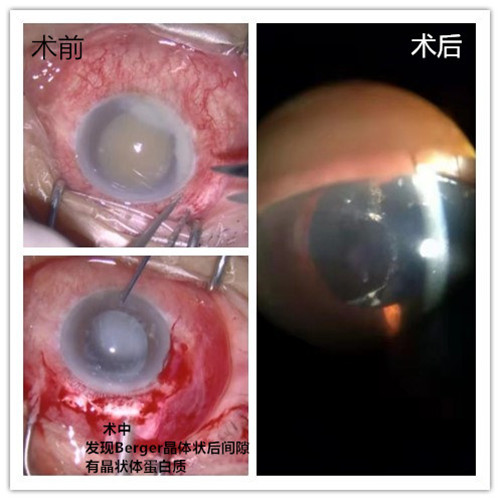 此例手术是渭南地区眼科的重大突破,也是西北地区不可多得的手术示例。患者于2018年8月1日因“晶状体溶解性青光眼”入住市中心医院眼科,在手术过程中意外发现大量晶体蛋白渗入Berger晶状体后间隙这一极其罕见情况,在考虑到患者目前的痛苦和今后的生计问题,田瑾副主任果断决定撕开后囊,注吸渗出到晶状体后囊膜及玻璃体前界膜的蛋白,打破了以往的墨守成规。术后不仅降低了患者的眼内反应及眼压,还将原本只有光感的视力矫正到0.15,得到眼科前辈及同道的高度赞扬。