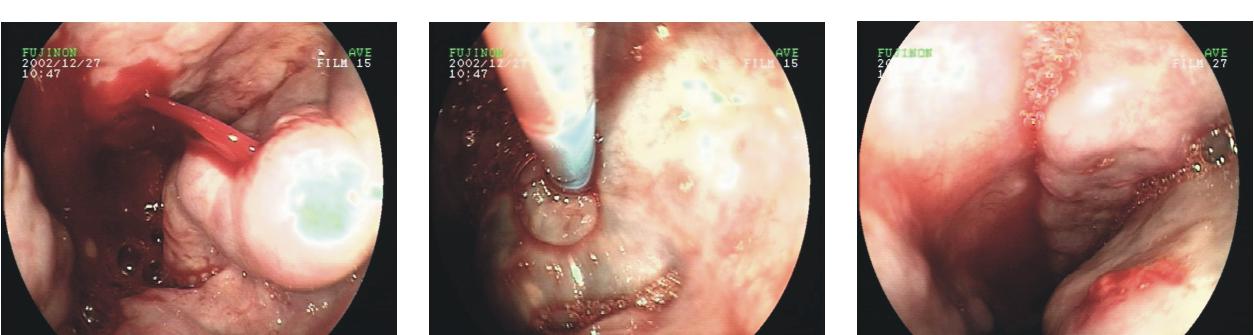 内镜中心迅速行动,李侠护士长选派骨干护士薛芝娟、钱坤准备手术用物,立即赶往手术室协助曹鹏医师进行手术。麻醉师雷玉华医师插管麻醉,在未拔除三腔两囊管的情况下,曹鹏医师迅速插入胃镜,观察到食管腔内有大量新鲜血液,食管静脉重度曲张,在距门齿35cm处可见曲张静脉上有一破口,并向腔内射血,立即置注射针于破口处,迅速注射组织胶,此时见曲张静脉迅速变硬、发白,破口被严密封堵住。出血已止,大家都松了一口气,患者抢救过来了,拔除三腔两囊管,转入ICU观察,2日后患者转回病房,目前患者病情平稳,未再出血。