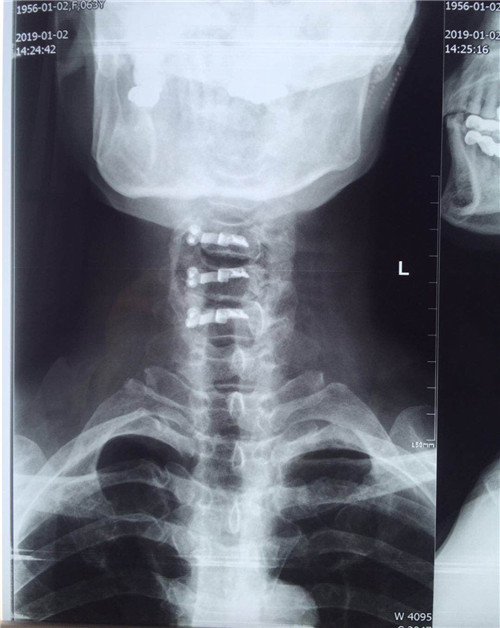 患者入院后,骨一科医护人员为其做进一步检查,诊断为多发颈椎间盘突出并继发颈椎管狭窄症。经讨论研究后,程福宏副主任医师决定为其行颈后路颈4、5、6的单开门椎板扩大成形术,该手术在王小峰主治医师的配合下完成。术中,医生为患者进行彻底的减压脊髓,固定椎板。术后患者恢复较好,症状改善明显,已能够独自行走,恢复正常活动。