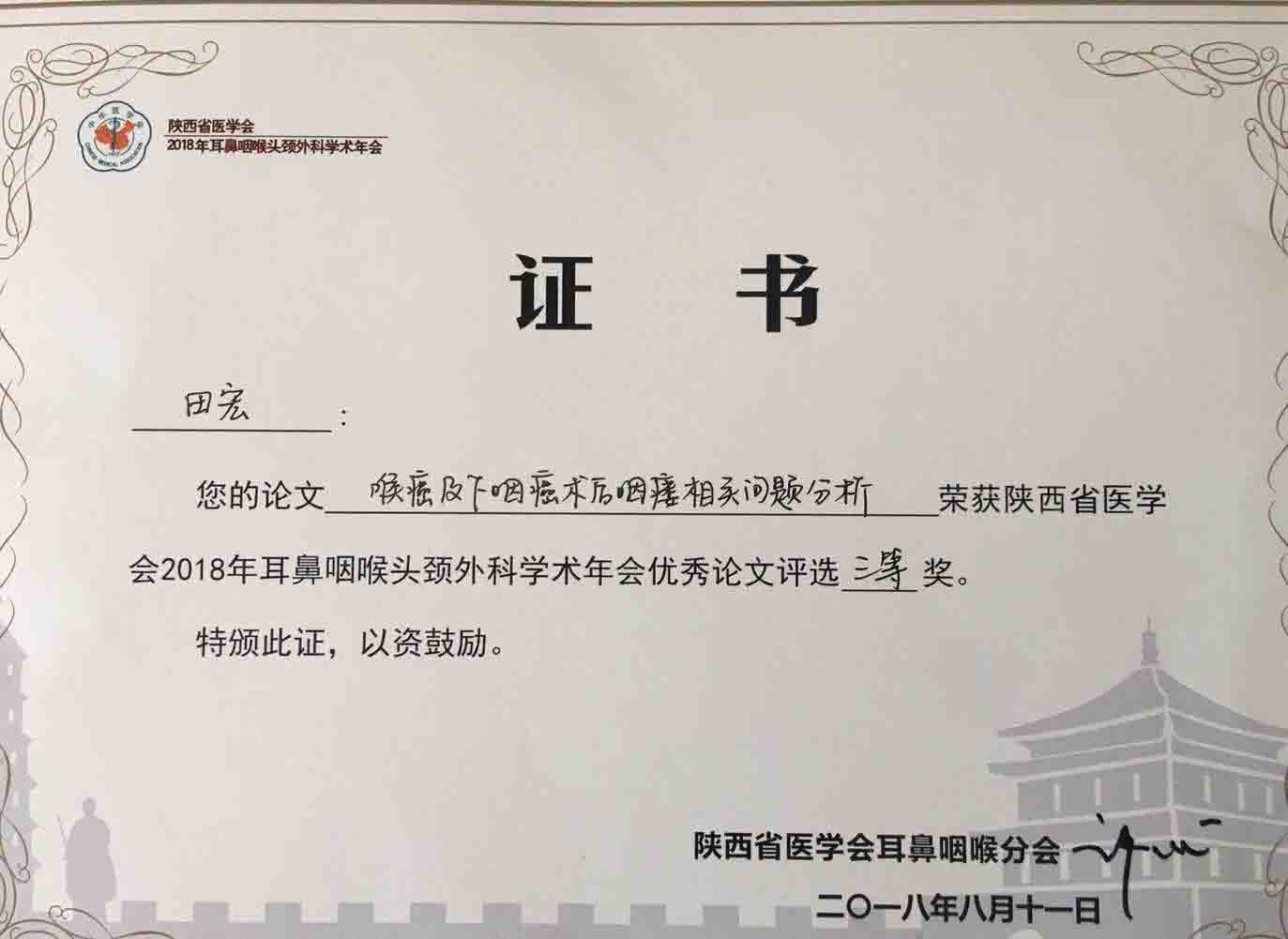 通过参加陕西省耳鼻咽喉头颈外科年会,耳鼻喉头颈外科论文投稿数量、论文被录用、大会交流、参加大会交流人数均名列前茅,代表了耳鼻咽喉头颈外科的团队精神,体现了团队的技术水平及理论水平,在陕西省耳鼻咽喉头颈外科专委会上多次受到表扬。
