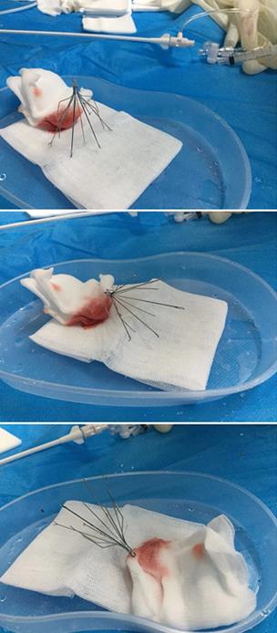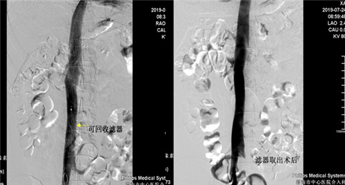 患者是一年轻男性,半年前因高血压性脑出血住院治疗,发现左下肢髂静脉股静脉腘静脉胫后胫前静脉血栓形成,由于脑出血有抗凝溶栓禁忌症,为预防肺栓塞的发生急诊行下腔静脉滤器(可回收)植入术,患者无脑出血后进行规范抗凝再无出血,超声复查下肢静脉血管未见新鲜血栓,D-二聚体正常,于7月24日早八点行经颈静脉下腔静脉滤器取出术,术后患者无腹痛发热出血等症状。