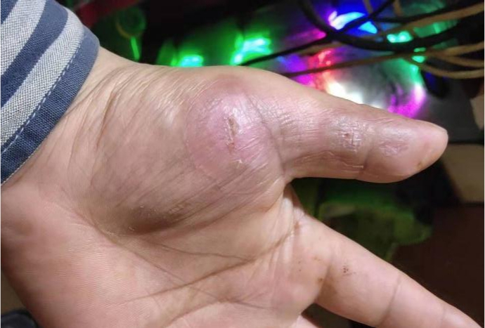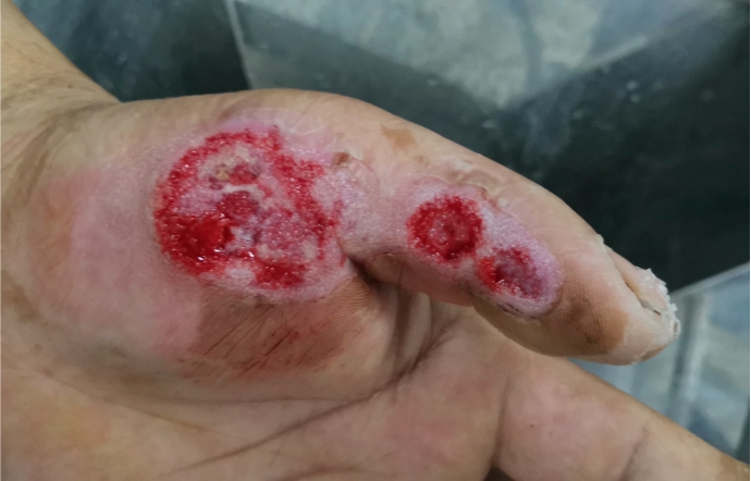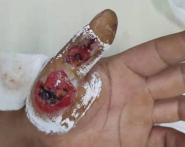 我院烧伤整形科门诊试运行期间,接诊一例氢氟酸烧伤病人。患者是华州区某化工厂工人,工作中不慎被氢氟酸烧伤左手。该工人伤后立即进行了去氟处理和钙剂浸泡,处理相对规范,由于伤势严重从外院转入我院。
