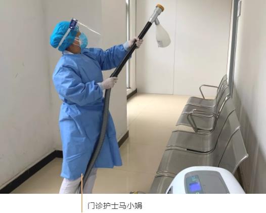 为了保证发热门诊的环境卫生安全和发热门诊隔离区、办公用具的消毒工作,门诊护士马小娟和郗宇萍,每天在岗位上忙碌穿梭着。由于防护的要求,他们每天都要戴上两层口罩和面罩后不停与患者沟通,几天下来,嗓子变得沙哑。