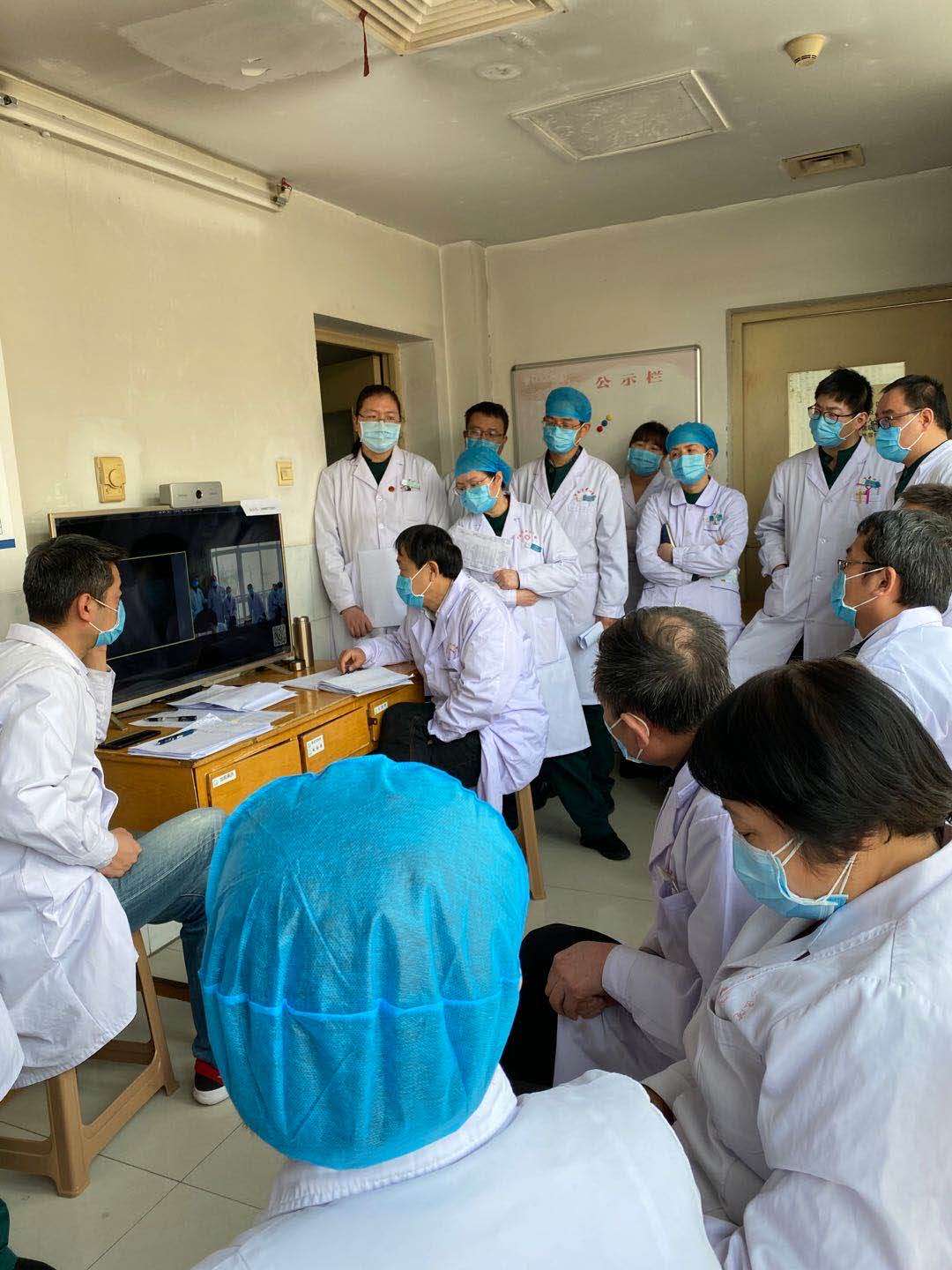 交完班,值班医生李永涛赶紧穿上防护服进病房看病人,其余当日不值班的医生赶紧准备十一点钟的MDT多学科会诊讨论病历资料。坐在我旁边的申世杰大夫是一线医生,她的爱人也是我们医院急诊科的一线护士,听他说刚过完年就把孩子和老人送回老家了,这样他们两口子就可以放心投入到这场战役中去了。在我身后是今年刚分到我们科的两名研究生,张静娇和焦俊喆,他们去年刚毕业才进科室,但是面对疫情,我在他们脸上看不到任何害怕和退缩,写病历,报数据,病人随访样样都信手拈来。正在给病人打电话的董黛青医生,本来她是去基层医院下乡支援的,因为疫情她主动请缨回科室管病人。