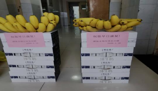 说干就干,支部党员赵书香立刻去超市买了奶和香蕉,分给目前还在隔离治疗的8位患者,写上我们支部党员的共同心声:祝您早日康复!并通过护士赠与每一位患者。